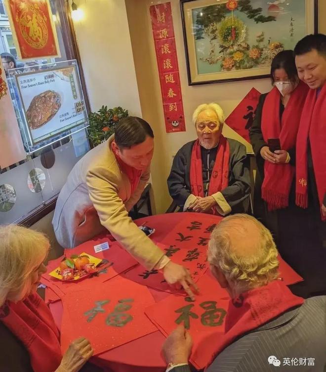 图说:2022年春节,当时仍为王储如今的英国国王夫妇,专程到访伦敦华埠祝贺新春,单声博士现场向王储夫妇展示了如何写春联,朱良玮医生向查尔斯夫妇解释了春节春联等中国传统文化,并教王储夫妇写了“福”字。